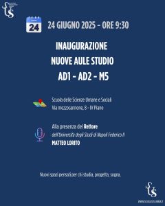 Un nuovo capitolo si apre per la Scuola delle Scienze Umane e Sociali dell’Università degli Studi di Napoli Federico II. Al quarto piano dello storico edificio di Via Mezzocannone 8, saranno inaugurate martedì 24 giugno 2025 le nuove aule studio AD1, AD2 e M5, pensate per offrire agli studenti un ambiente moderno, funzionale e stimolante.